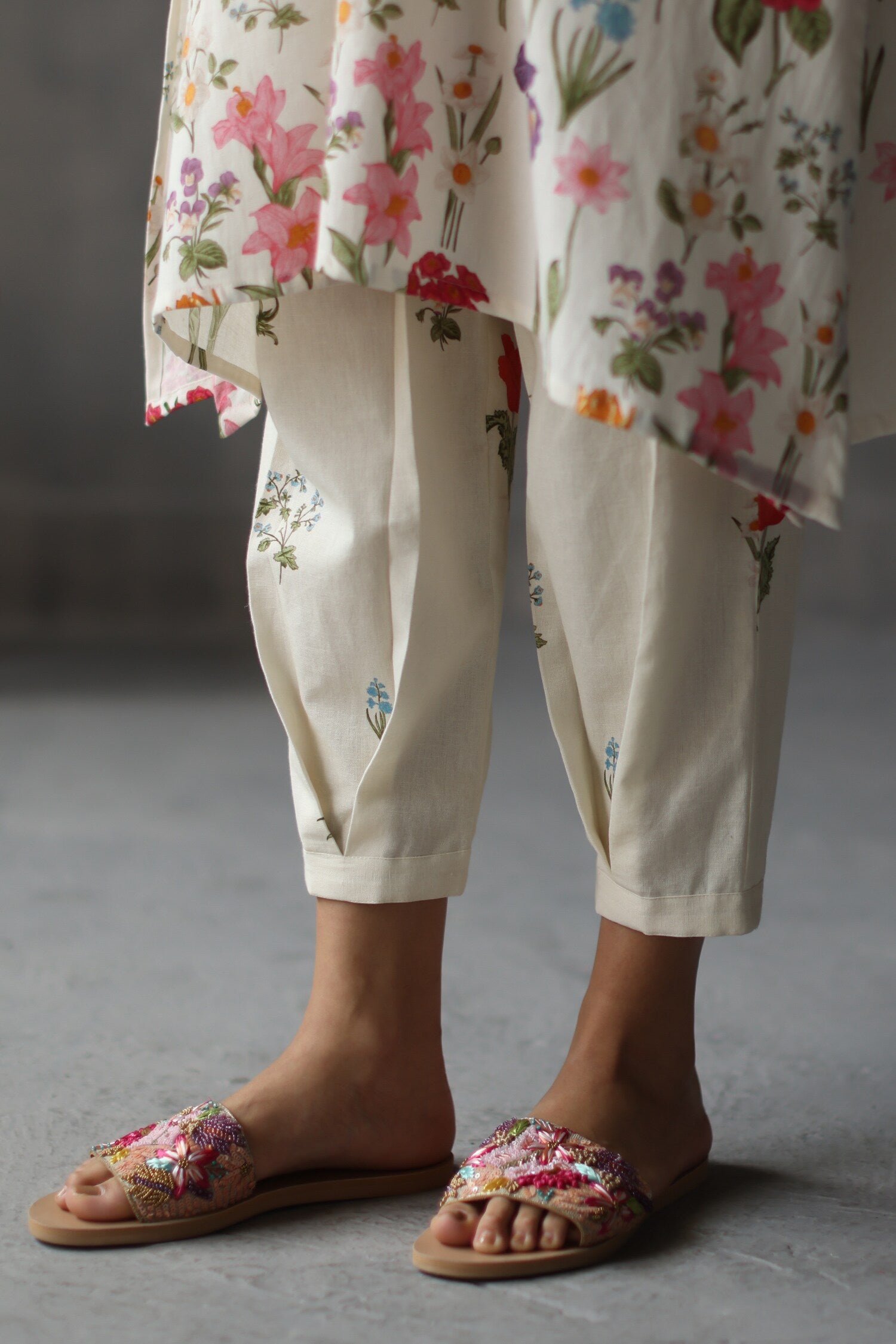 Ivory Linen Hand Drawn Floral V Primrose Pattern Kurta And Box Pleated Pant Set