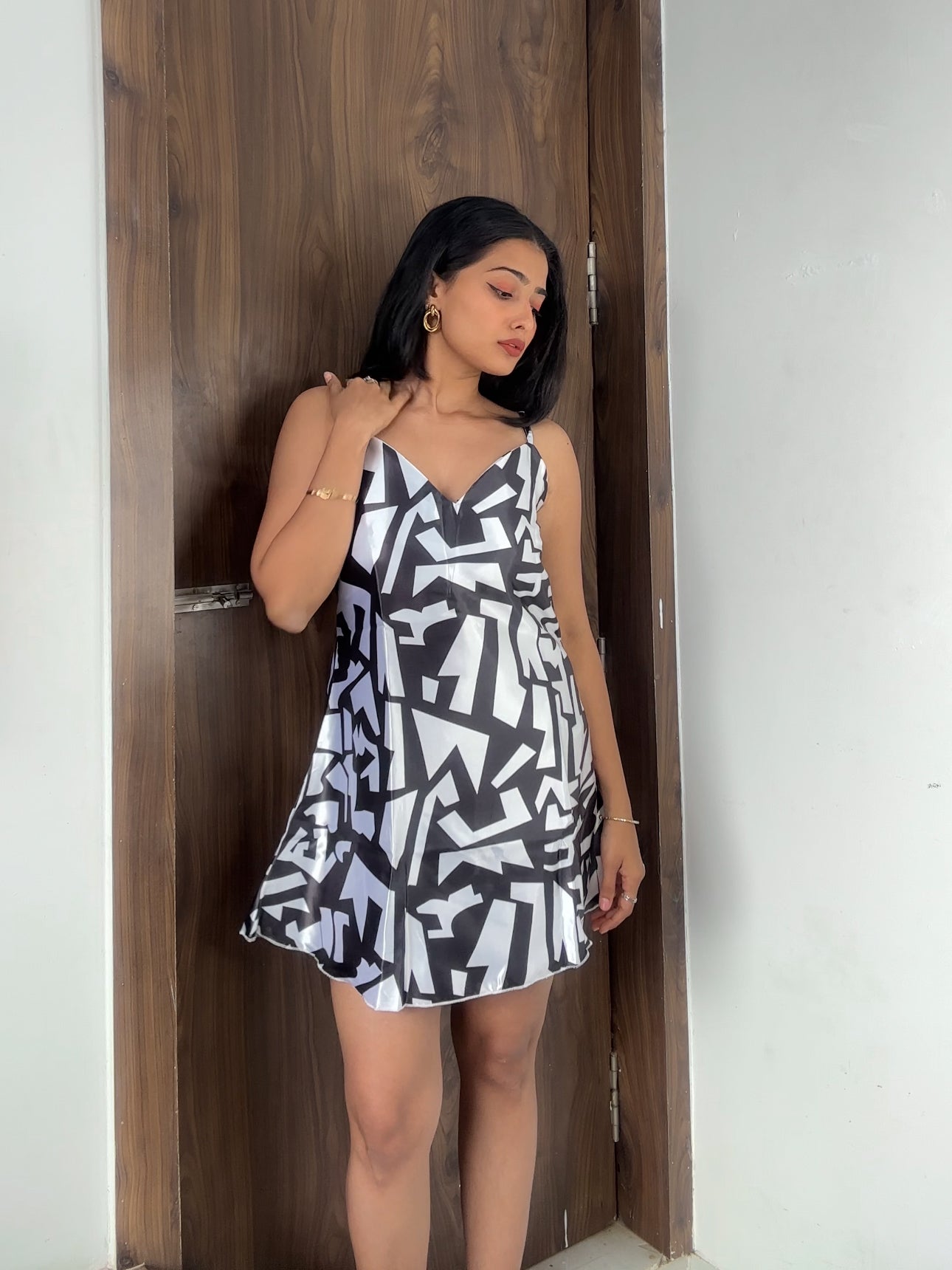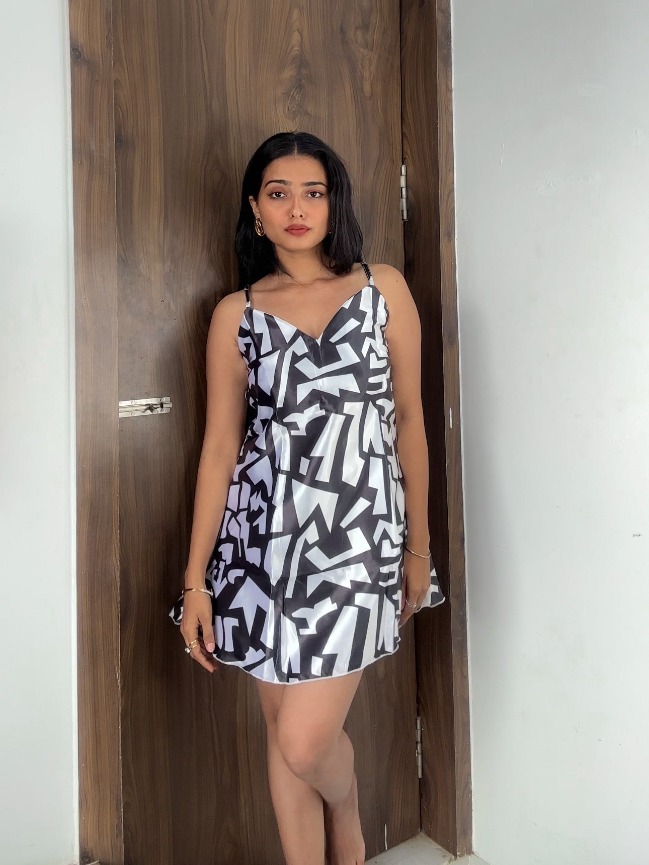 Abstract Satin Nightgown, Casual V Neck Backless Dress