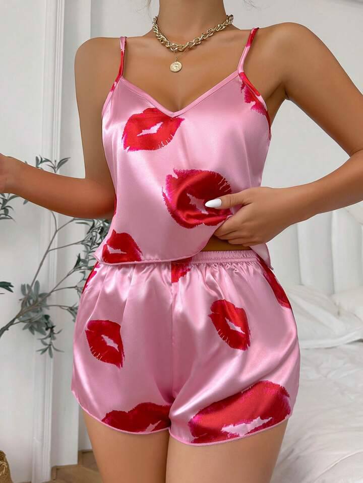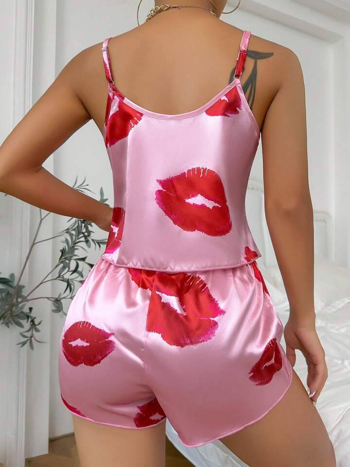 Baby Pink Lip Printed Contrast Binding Cami Night Dress