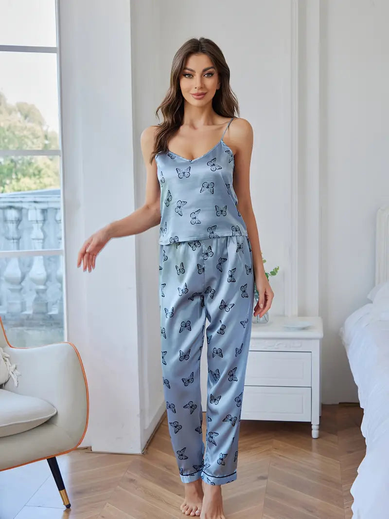 Butterfly Print Satin Pajama Set for woman, Without Inner Wear, Women's Sexy Clothing