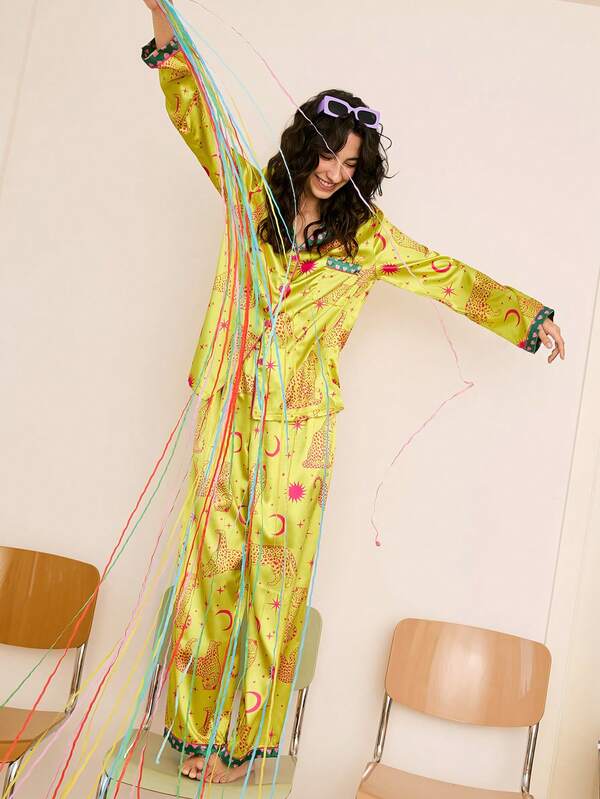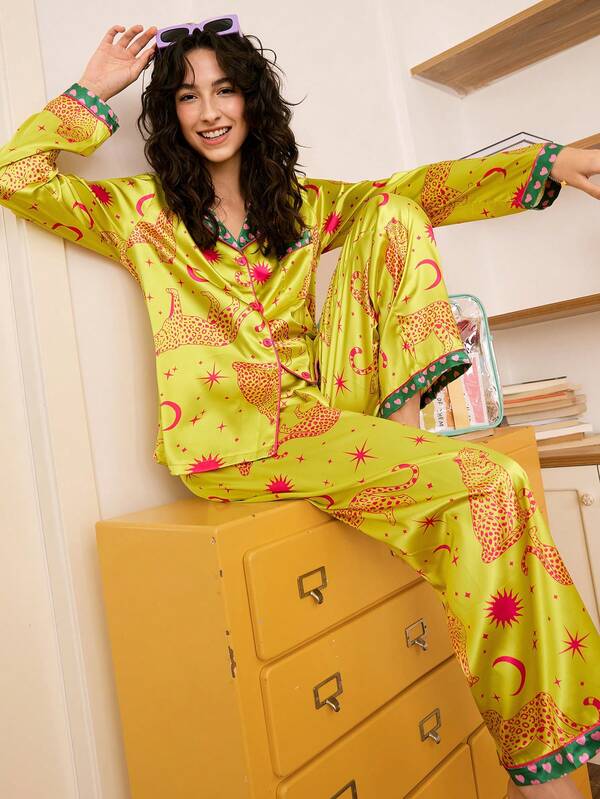 Chill nights Valentine's Day Couple Young Fashion Leopard, Star, Heart Print Contrast Cuff & Collar Open Front Knit Pajama Set For Women.