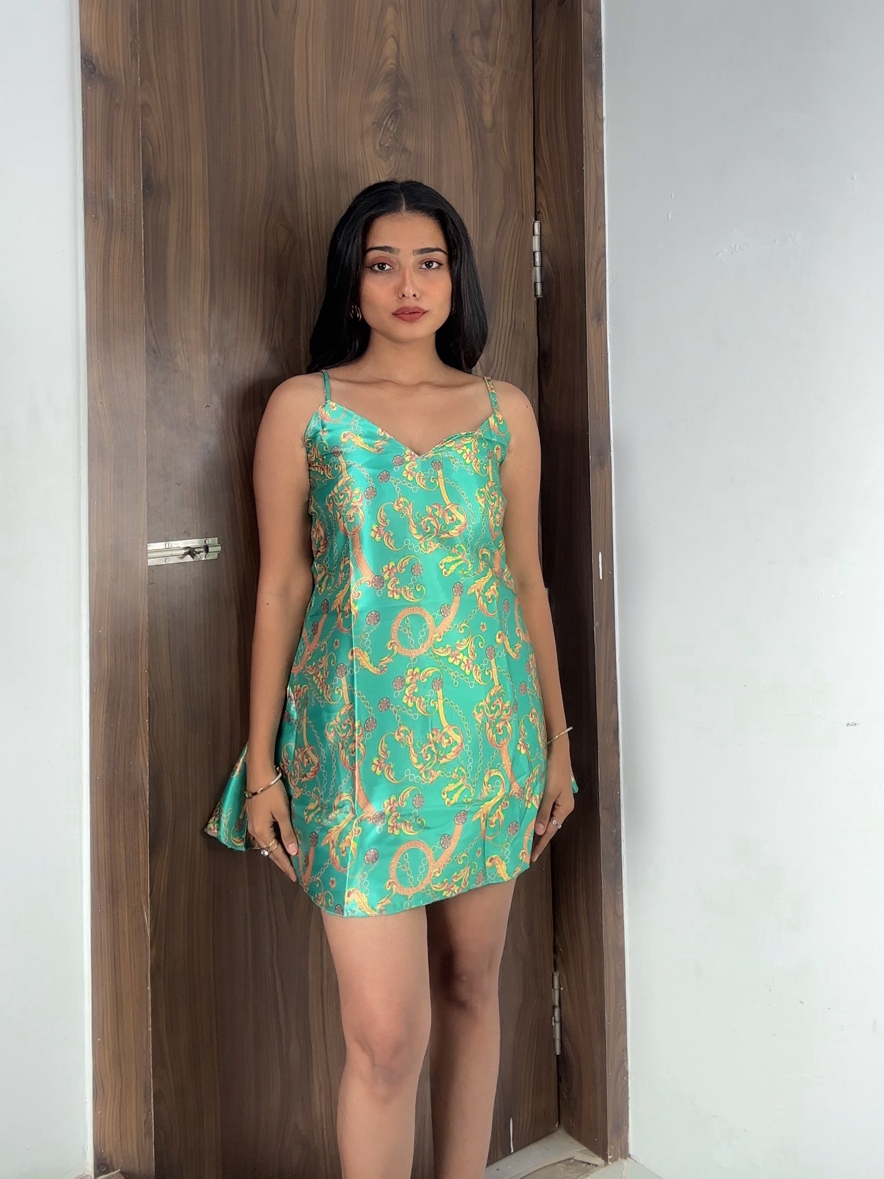 Green Satin Nightgown, Casual V Neck Backless Dress